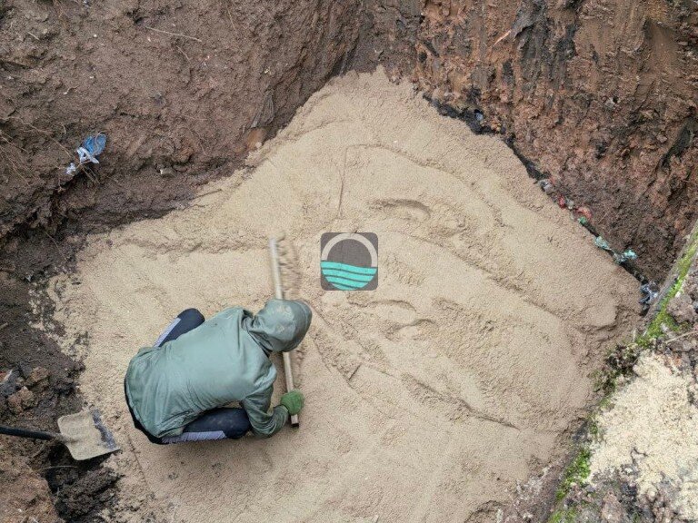 - Подготовка подушки из песка и щебня, выравнивание основания.